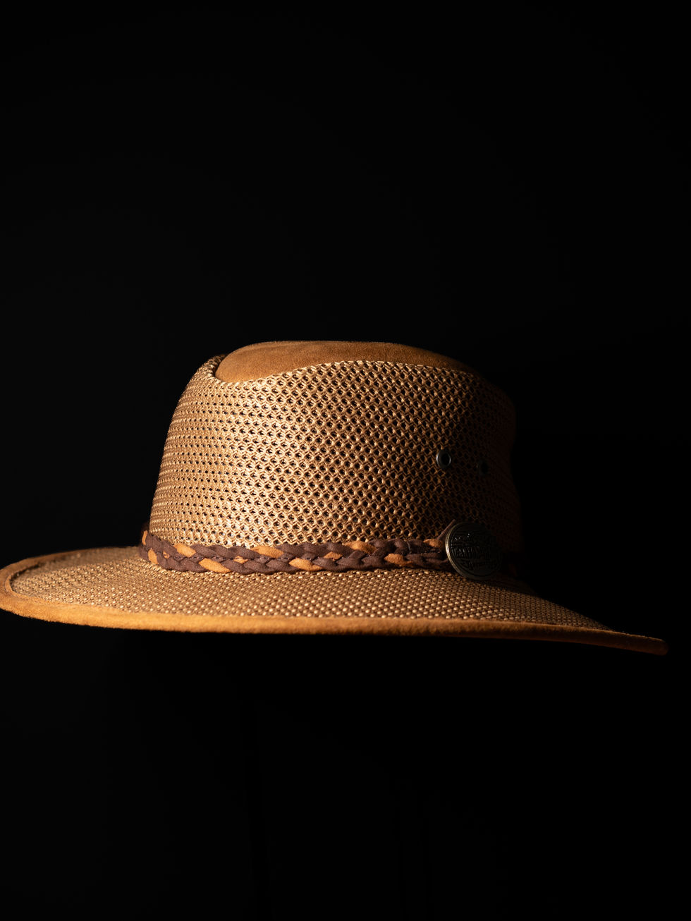 Handmade in Guanajuato, Mexico, this hat features a premium leather brim and crown accents, seamlessly blending with an intricately woven mesh body for breathability and all-day comfort. The braided leather band, adorned with a signature metal emblem, adds a rugged yet refined touch, making it the perfect companion for adventurers who embrace the sun, the open road, and the call of the wild.